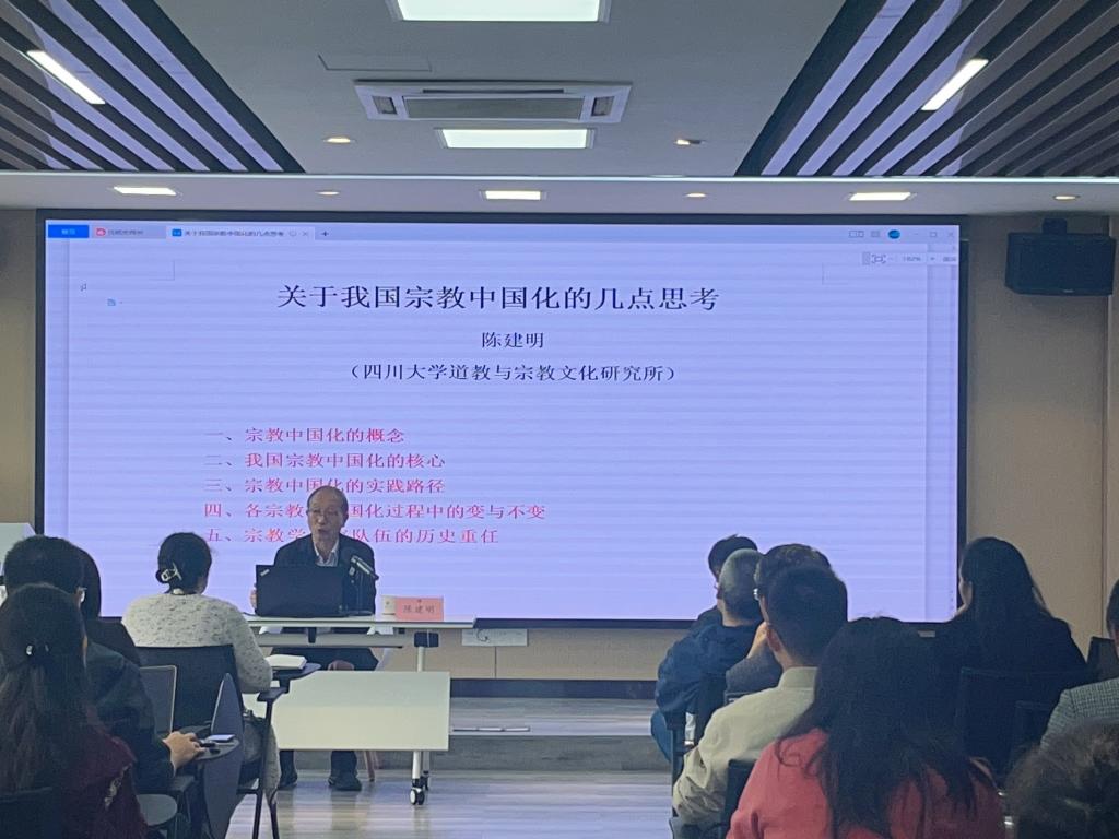 讲座伊始,陈建明教授首先解释了宗教中国化的概念。宗教中国化就是实现从“宗教在中国”向“中国宗教”的深度转化。在转化过程中,最核心的要求是各宗教对党和国家政治上认同,要爱国爱教。