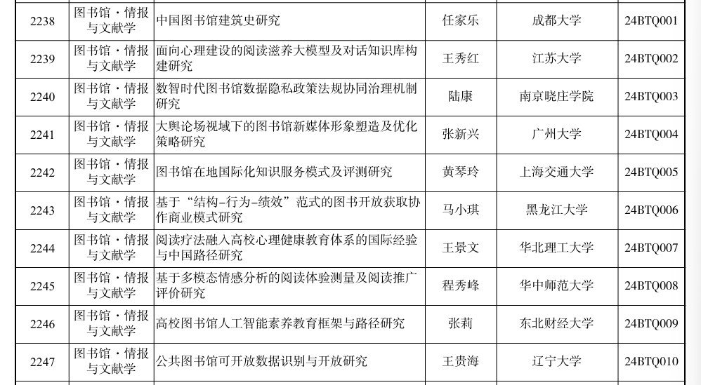 10月15日,全国哲学社会科学工作办公室公布2024年度国家社会科学基金年度项目立项课题名单,我校任家乐教授申请的《中国图书馆建筑史研究》项目,编号24BTQ001,获图书馆情报与文献学一般项目立项第一名,这是任家乐教授第三次获得国家社科基金一般项目立项。