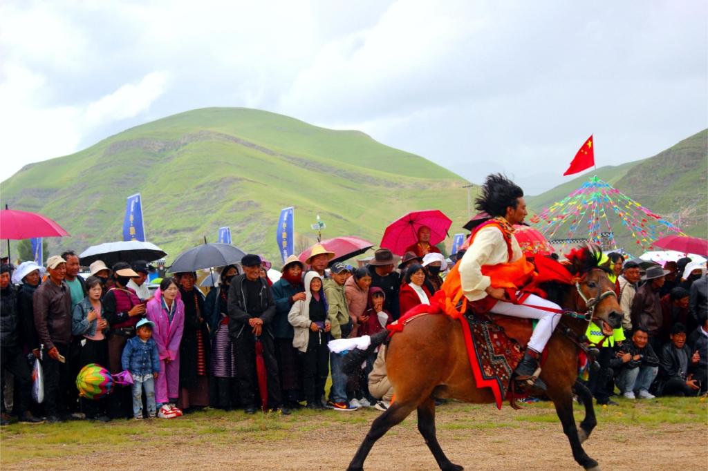日出时分,团队成员们来到赛马场,此刻赛马场外却已经围了许多藏族民众。参赛的藏族民众身着鲜艳的藏族服饰,手握缰绳,骑着健壮的赛马在泥泞的赛道上奋力冲刺。赛马项目丰富多彩,包括跑马、跑马射箭、跑马捡哈达等,每一个项目都吸引了大量观众驻足观看。