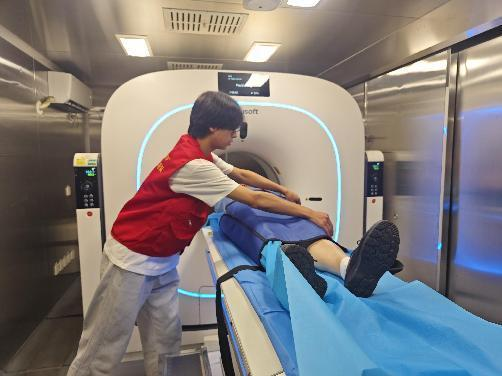 ct检查是体检中必不可少的一个项目,ct具有很高的密度分辨率,可以更好的显示头部、胸部、腹部器官、骨骼系统等疾病,可以早期的发现病灶、具有高度灵敏性和准确性以及可用于全身各处的检查。团队成员引领需要进行ct检查的铁路员工到ct仪器上躺好,并做好防护,随即医生进行检查。