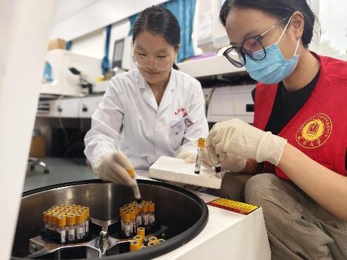 团队成员在检验科进行志愿服务,将前来体检的铁路工作人员血液样品从离心机内进行分类,便于后续检验科医生带回医院进行专业检测。这项工作需要团队成员全神贯注并且保持足够的耐心,将三种不同的血液样品分开。