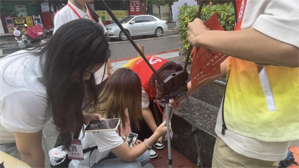 图为实践队在绵阳市盐亭县桂花街进行普法时遭遇突发情况,立体海报无法支撑,团队成员通过查询修复教程、安装教程,共同合作重新组建支架,寻找支架并且重新组装立体海报,在全成员共同努力下,海报成功安装。