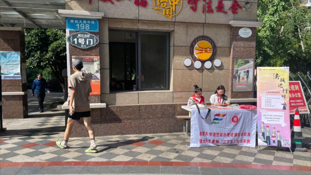 为了更好地进行社区普法,及时提供法律咨询帮助,实践队在普法的阳光水岸小区区门口设立了普法实践驻扎点。由两人守在岗位上,其余成员至周边发放传单,确保社区法律咨询活动落细落实。