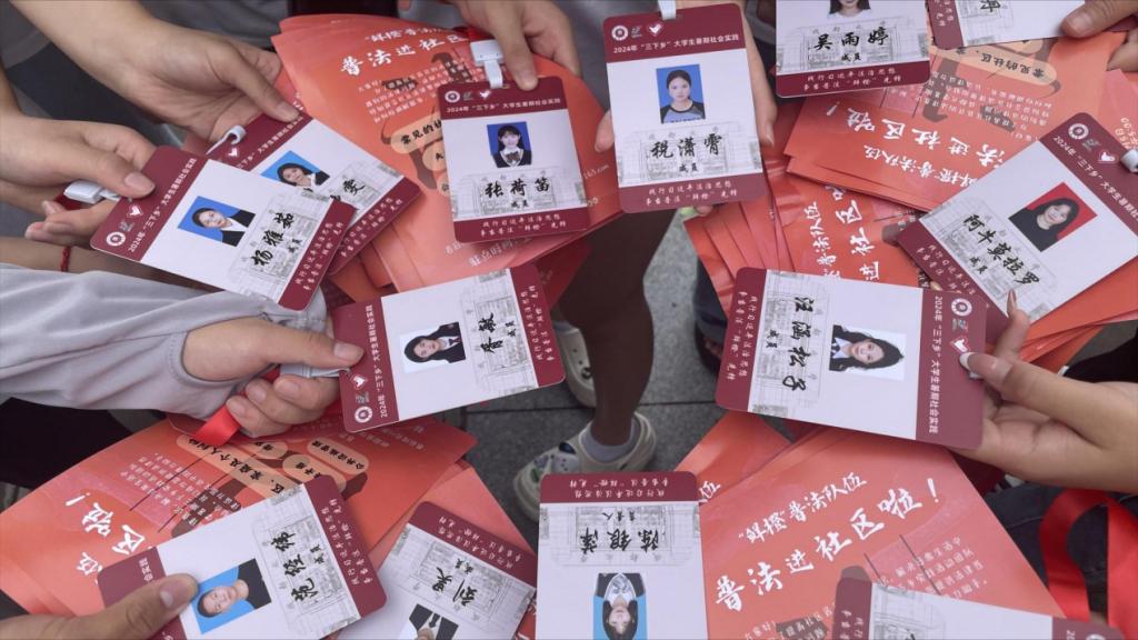 图为实践队在社区普法时对工作牌、宣传单进行合照