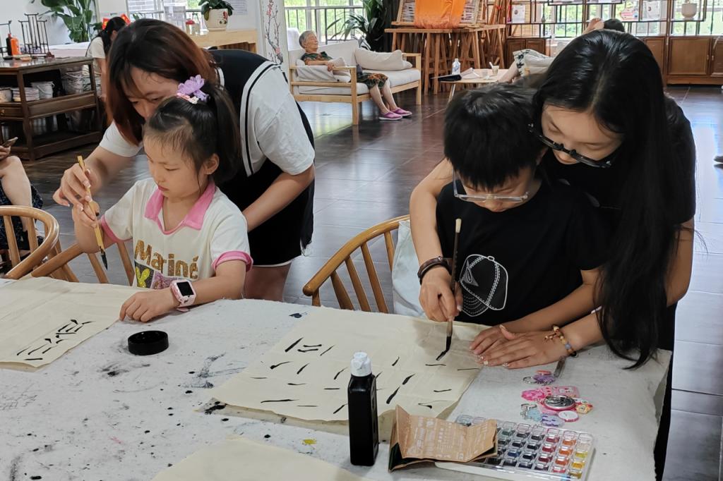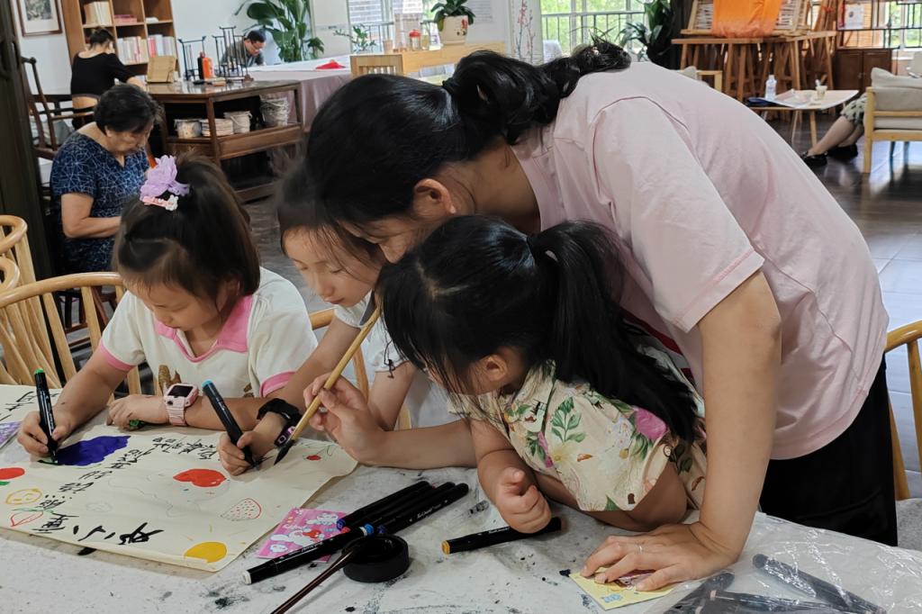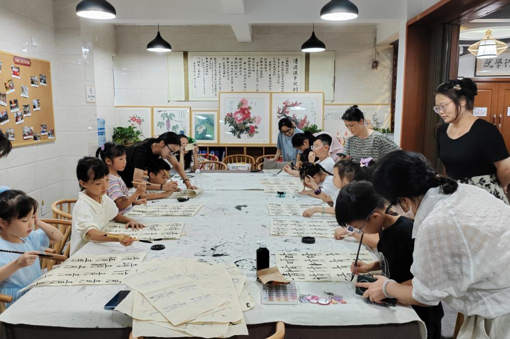 孩子们围在一起,手握着毛笔,沉浸在创作的乐趣中。他们的笔触虽显稚嫩,却饱含纯真与想象,展现了孩子们丰富的内心世界和对美的追求以及对书法的热情。