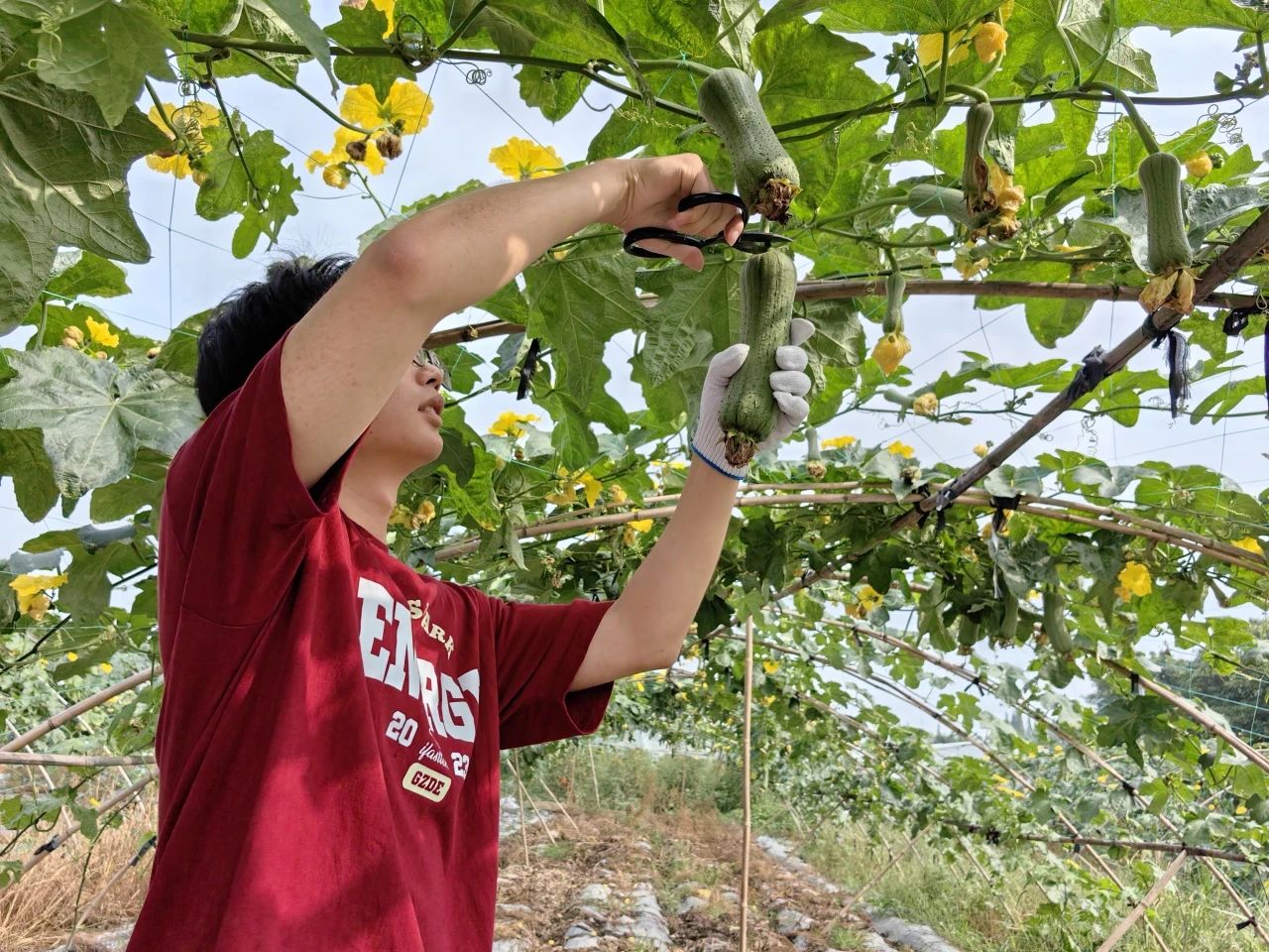 团队成员来到鑫农人蔬菜种植基地,首先参观了番茄基地,了解到“迷黄”、“迷红”品种番茄已成为世园会供应农产品,观察当今农业在技术方面产生的进步;随后,团队成员协助基地采摘丝瓜,亲身体验农活。