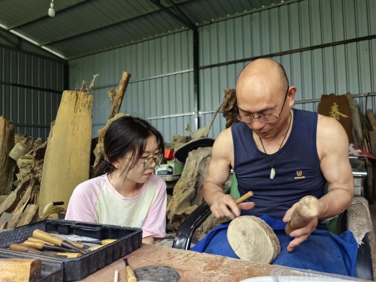 团队部分成员来到兰光树根雕工作室,观摩学习兰光树老师制作根雕的过程,并用视频记录下来,通过抖音、小红书传播,让更多人了解根雕这一传统工艺。