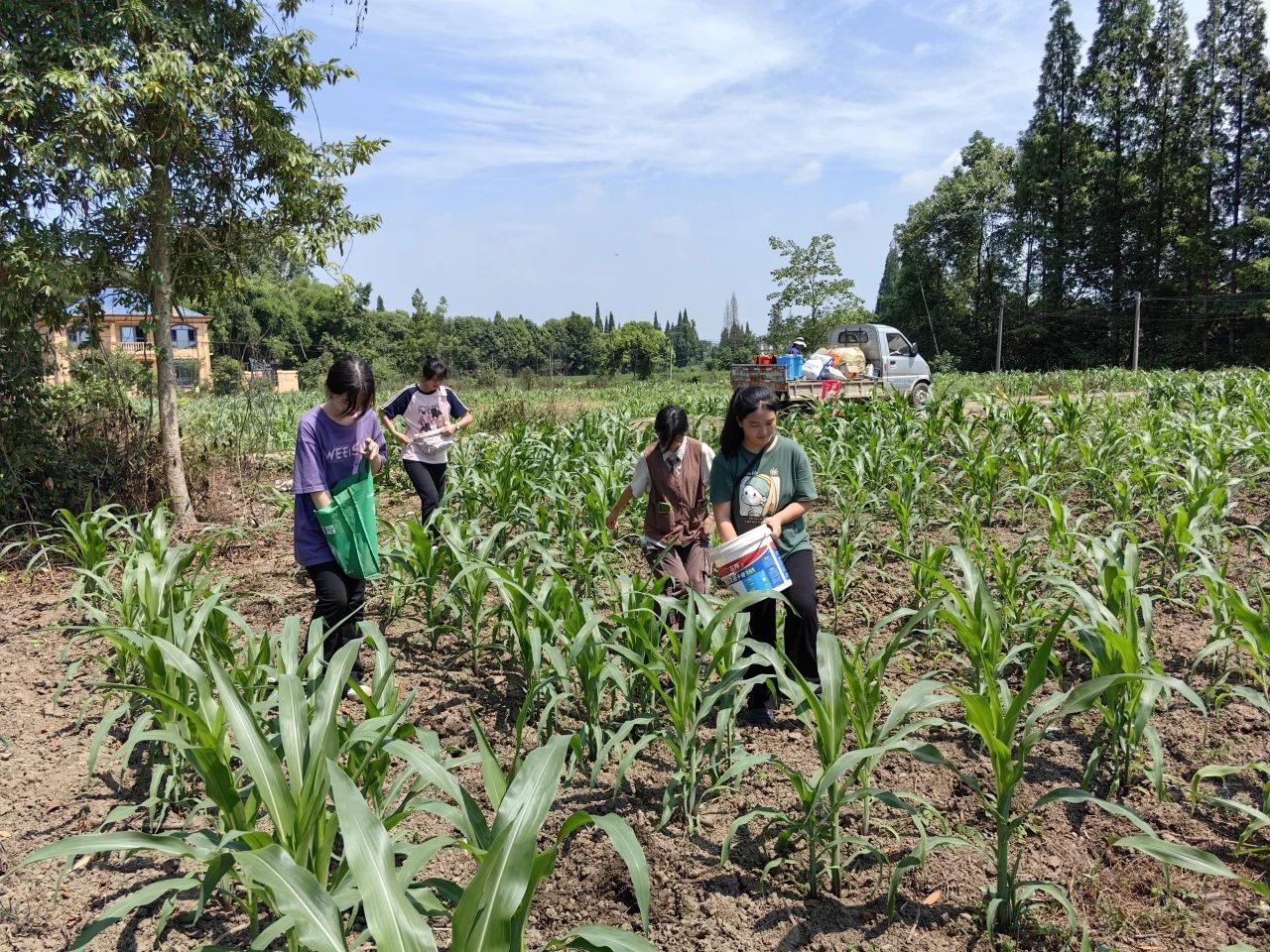 团队成员跟随农民伯伯来到玉米地进行黄豆复种,对于黄豆复种技术形成初步认识,另一方面团队成员也通过下地劳动了解到了当前农业存在的部分问题。