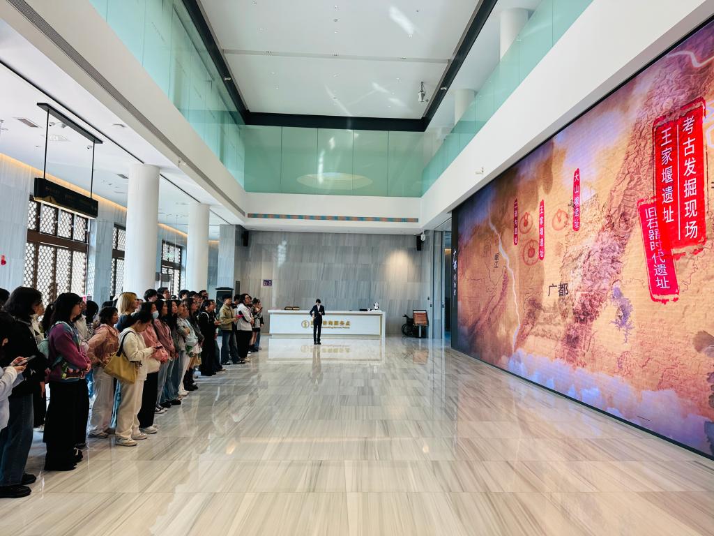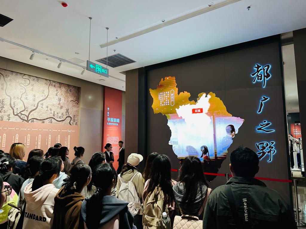 《山海经》记载:“西南黑水之间,有都广之野,后稷葬焉。”“都广”即“广都”,位于现在的成都市双流区。这里土地肥沃,物产丰富,是古蜀农业文明起源地之一,也是天府之国农业中心地区。汉武帝元朔二年,在蜀郡设置广都县;隋仁寿年间,为避太子杨广讳,广都更名为双流。广都的人类文明始于距今约10万年的新石器时代;而广都的城市史,兴起于汉,茁壮于唐宋,繁荣至明清至今天。进入博物馆大厅,同学们首先通过视频了解了双流地区历史发展的脉络。