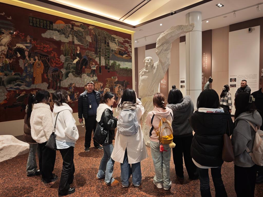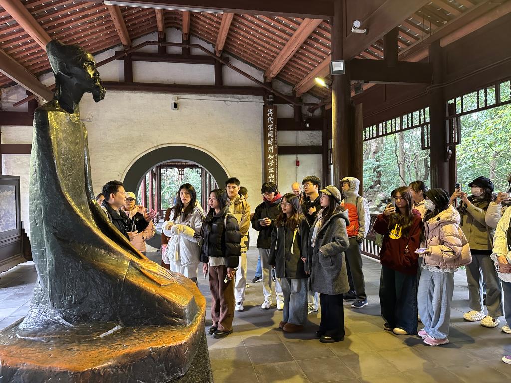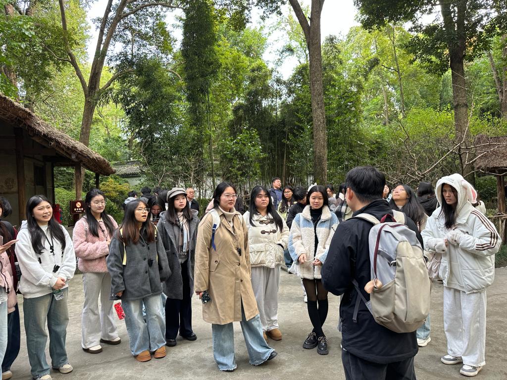 参观过程中,讲解员老师结合现场实景与天府文化特质,对杜甫的经典诗作进行深度解读,从“安得广厦千万间,大庇天下寒士俱欢颜”中蕴含的深厚家国情怀,到“随风潜入夜,润物细无声”里流露的细腻人文观察,逐一剖析诗句背后的精神内核与价值追求。同学们或驻足记录,或凝神思索,不时就诗歌中的文化符号、历史语境与老师们展开热烈探讨,原本停留在书本上的理论知识,在实地参观体验中转化为直观鲜活的文化感知。