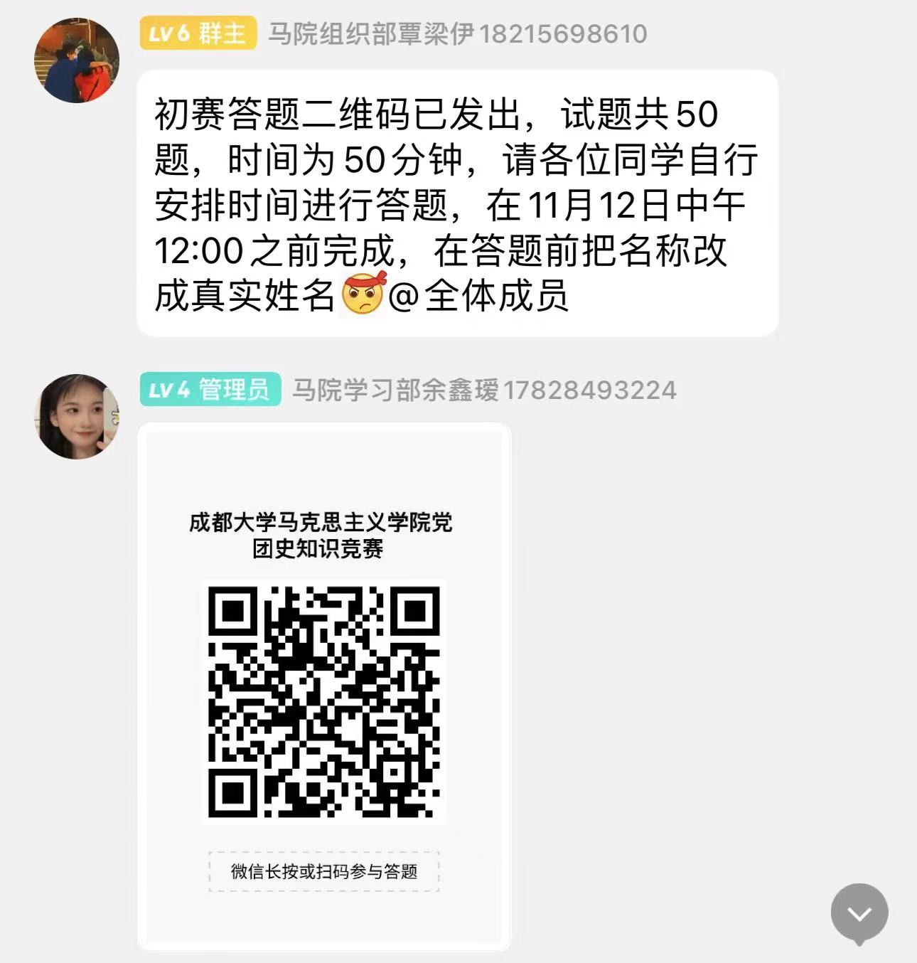 11月9日至11月12日,党团史知识竞赛活动初赛正式开幕,共有参赛同学400余人。初赛选择题二维码发送到线上竞赛群中,报名竞赛者进行线上考卷测试,全卷共100分。选手们积极参赛,积极答题,进入前50名的同学晋升到下一轮。