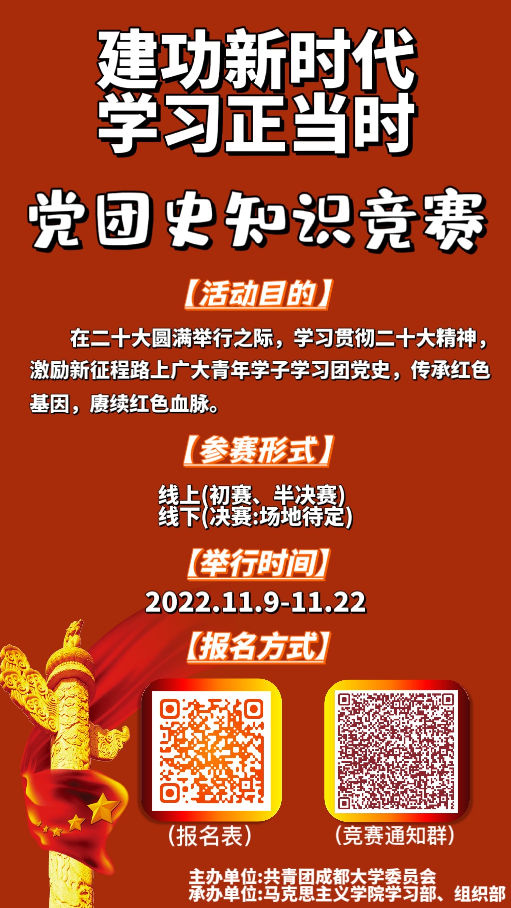 为学习贯彻中国共产党第二十次全国代表大会精神,激励新征程路上广大青年学子学习党史、团史,传承红色基因,赓续红色血脉。成都大学校团委主办,csgo投注