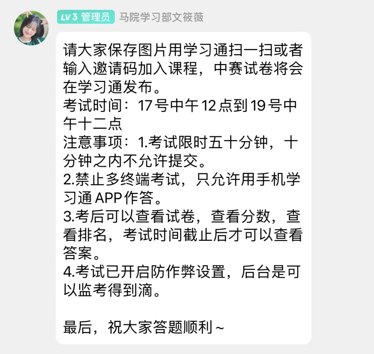 11月17日至11月19日,党团史知识竞赛进入半决赛,为使竞赛更加公平公正,此轮比赛更换答题平台,选用学校统一的教学平台:学习通。晋级竞赛者进行线上考卷测试,全卷100分。经过两天的赛程,前30名选手顺利晋级。