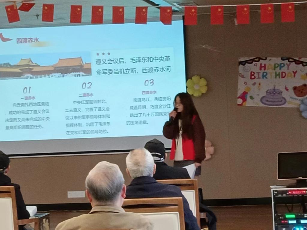 宣讲伊始,主讲人马诗诗从遵义会议会址的外观及内部陈设切入宣讲主题,并深入浅出地讲述了遵义会议的历史背景和开展进程。随后,主讲人为爷爷奶奶们讲述了一则长征小故事,又一起朗诵了毛主席的诗歌——《七律·长征》,让爷爷奶奶们更加深刻地了解到了红军长征途中的艰难与不易。最后,主讲人也向大家分享了“多元”遵义,“红色”是遵义这座城市的亮点,但除了“红色”之外还有独特的人文景观、佳肴美食,让大家深入了解了这座城市。