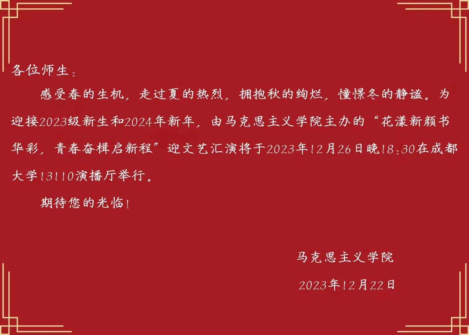 组织举办一场以“花漾新颜书华彩,青春奋楫启新程”为主题的迎新文艺汇演,这场跨越时空,精彩演绎的汇演即将揭开它神秘的面纱,终于要和大家见面了。迎新节目汇演节目类型琳琅满目,既有娓娓动听的红色歌曲,又有声情并茂的朗诵,还有婀娜多姿的青春舞蹈、悦耳动听的乐器表演、气势磅礴的情景剧。每一个节目都经过了层层的选拔和细致的彩排,节目效果定能引人入胜、扣人心弦,让观众一饱眼福。北风呼呼雪花飘,举国欢庆佳节日。元旦佳节,是一年的起点;快乐,是人生的重点;烦恼,永远降到冰点;时间,是情谊的钟点;祝福是短信的焦点。新的一年,愿所有人都能占领幸福的制高点,处处春光无限。预祝迎新文艺汇演成功举行,也提前祝大家元旦快乐。最后,期待大家的到来,12月26日晚上,我们,不见不散!