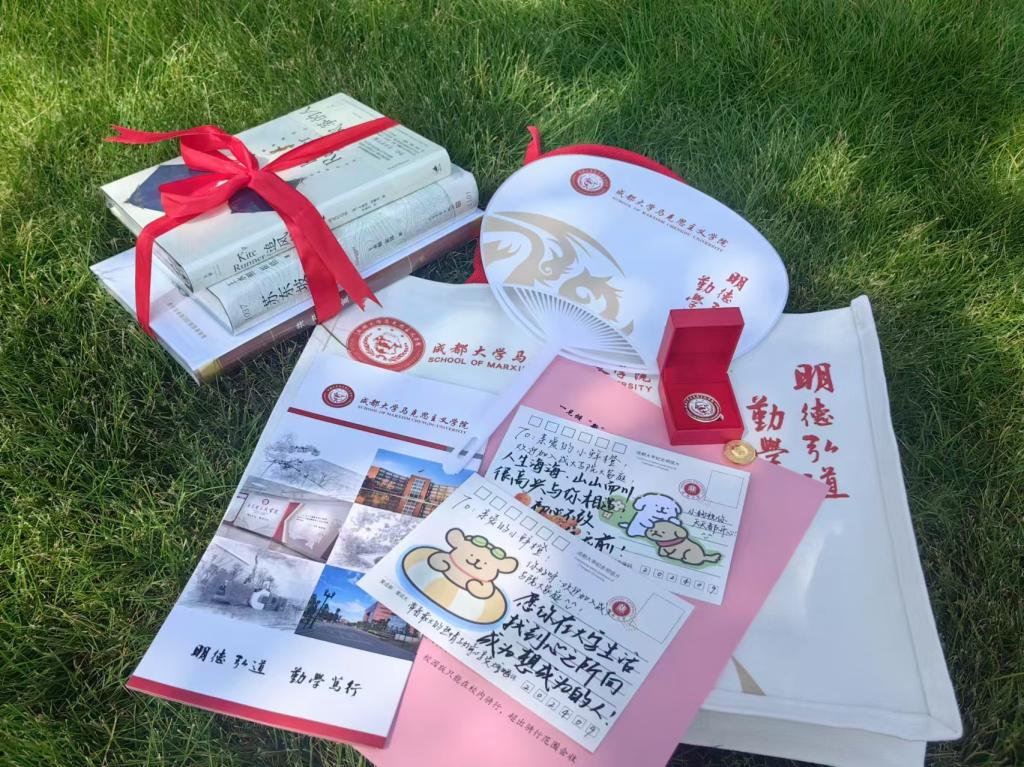 定制笔记本、扇子、矿泉水、新生温馨提醒单,还有学长学姐们精心准备的明信片。满满当当的新生大礼包蕴含着马院最诚挚的关怀。