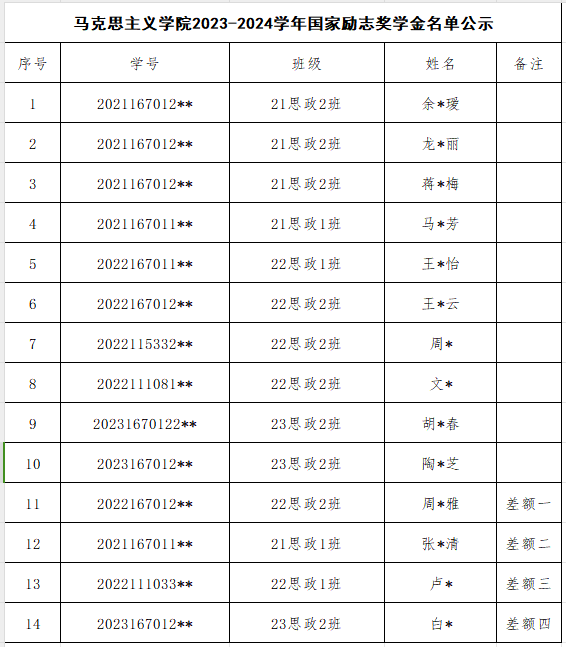 汇总审核,在公平、公正、公开的原则下,拟推荐余*瑷等14人为2024学年国家励志奖学金资助对象,其中包含差额4人,现将名单进行公示。