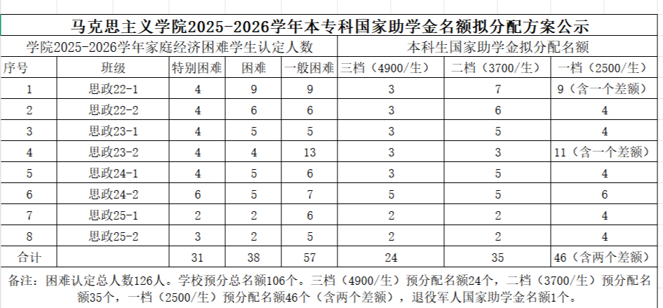 根据《成都大学关于做好2025年普通高等学校本专科生国家助学金评审工作的通知》相关要求,csgo投注 2025-2026学年国家助学金预分名额共106名。现将csgo投注 国家助学金名额分配方案公示如下: