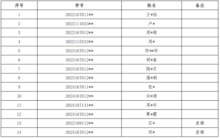 国家奖助学金评审工作小组审议等环节,拟推荐王*怡等14人为2025年国家励志奖学金推荐人选,其中包含差额2人,现将拟推荐名单公示如下: