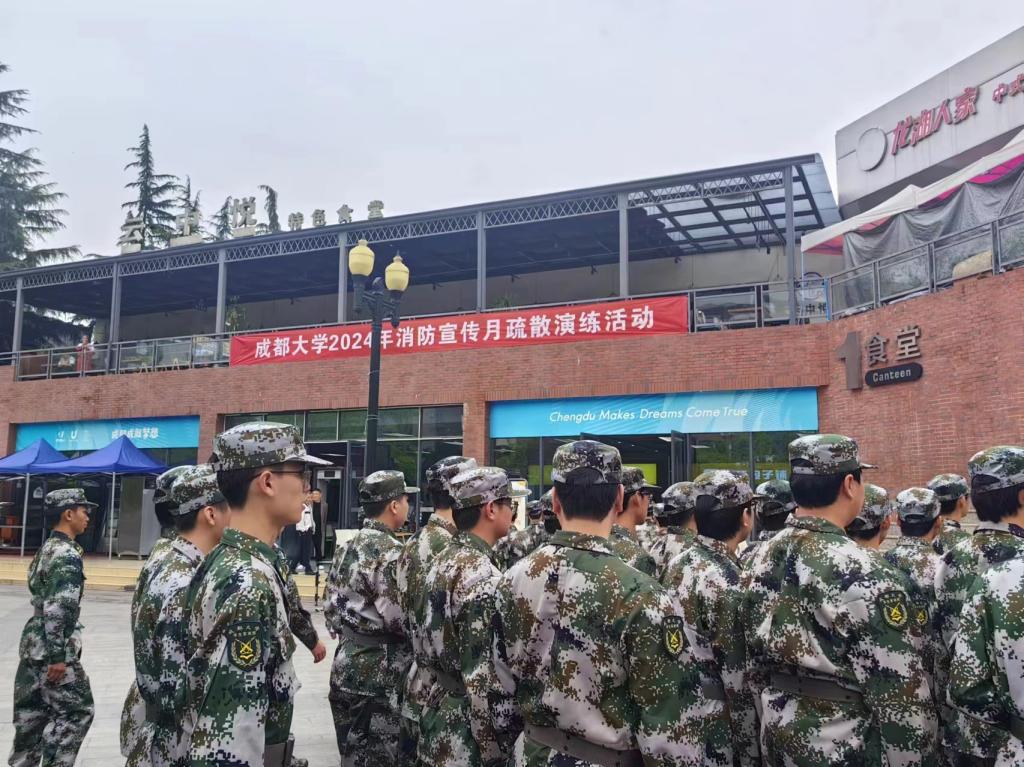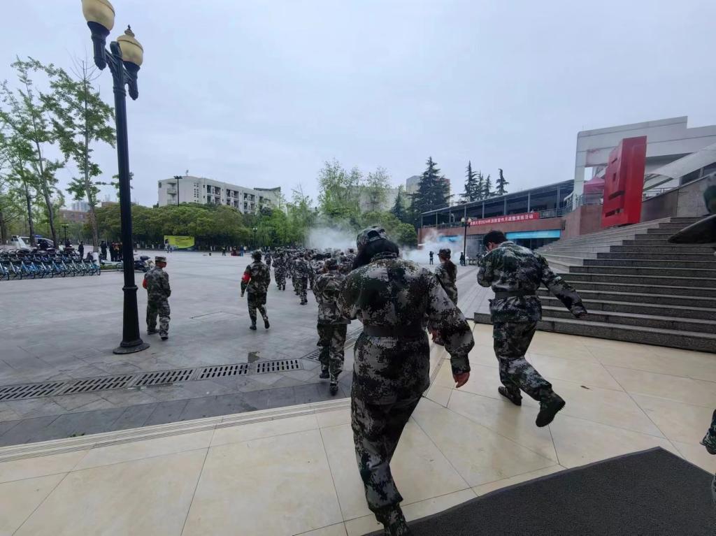 4月9日上午,我班学子和部分保卫工作人员参加模拟灭火和逃生演练。本次演练遵循“在军训期间组织安全技能培训”的惯例,由学校保卫处武装部组织开展成都大学消防宣传疏散月演练活动。
