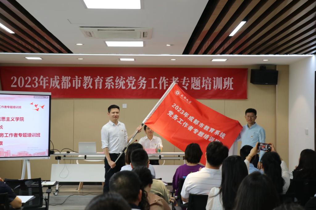 院长屈陆向培训班授予班旗,来自成都市武侯区教育局的冉天移老师代表全体学员接旗。