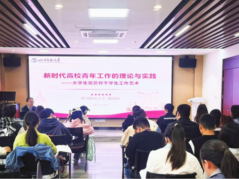 四川师范大学党委学生工作部(处)武装部部长胡尚峰,围绕学生骨干如何将工作的理论和实践相结合为主题,讲述了新时代的高校青年应当自觉将理论与实践相结合,做到知行合一,用科学的方法论指导实践,要做一名有理想,敢担当,能吃苦,肯奋斗的新时代好青年。