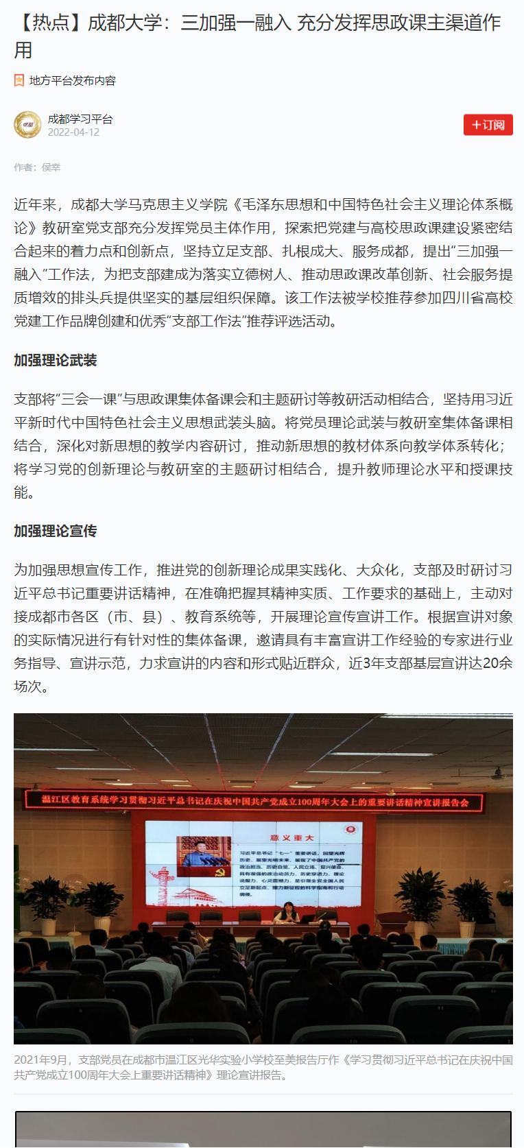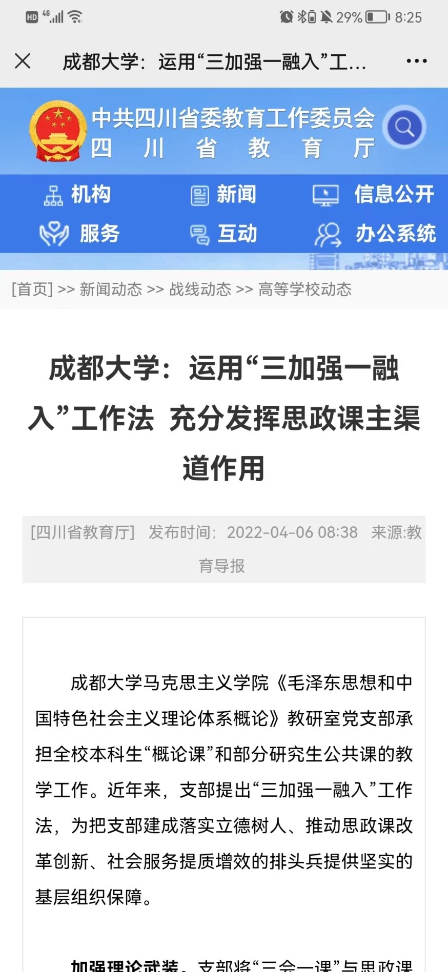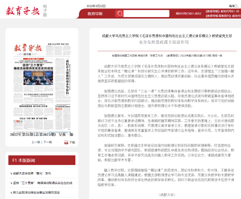 《毛泽东思想和中国特色社会主义理论体系概论》(简称“概论课”)教研室党支部 “三加强一融入”支部工作法获《教育导报》“学习强国”平台以及省教厅高校动态网页等报导。