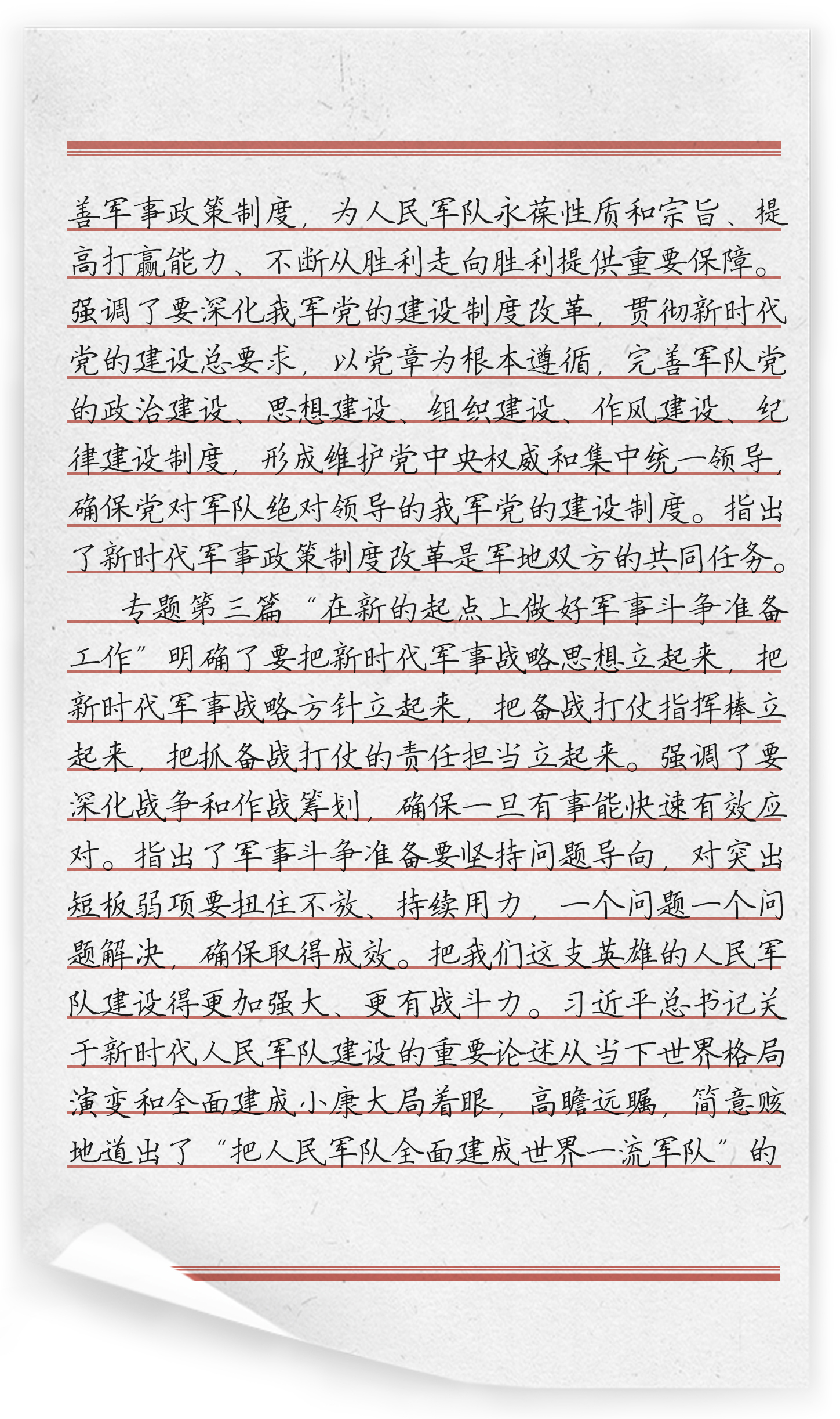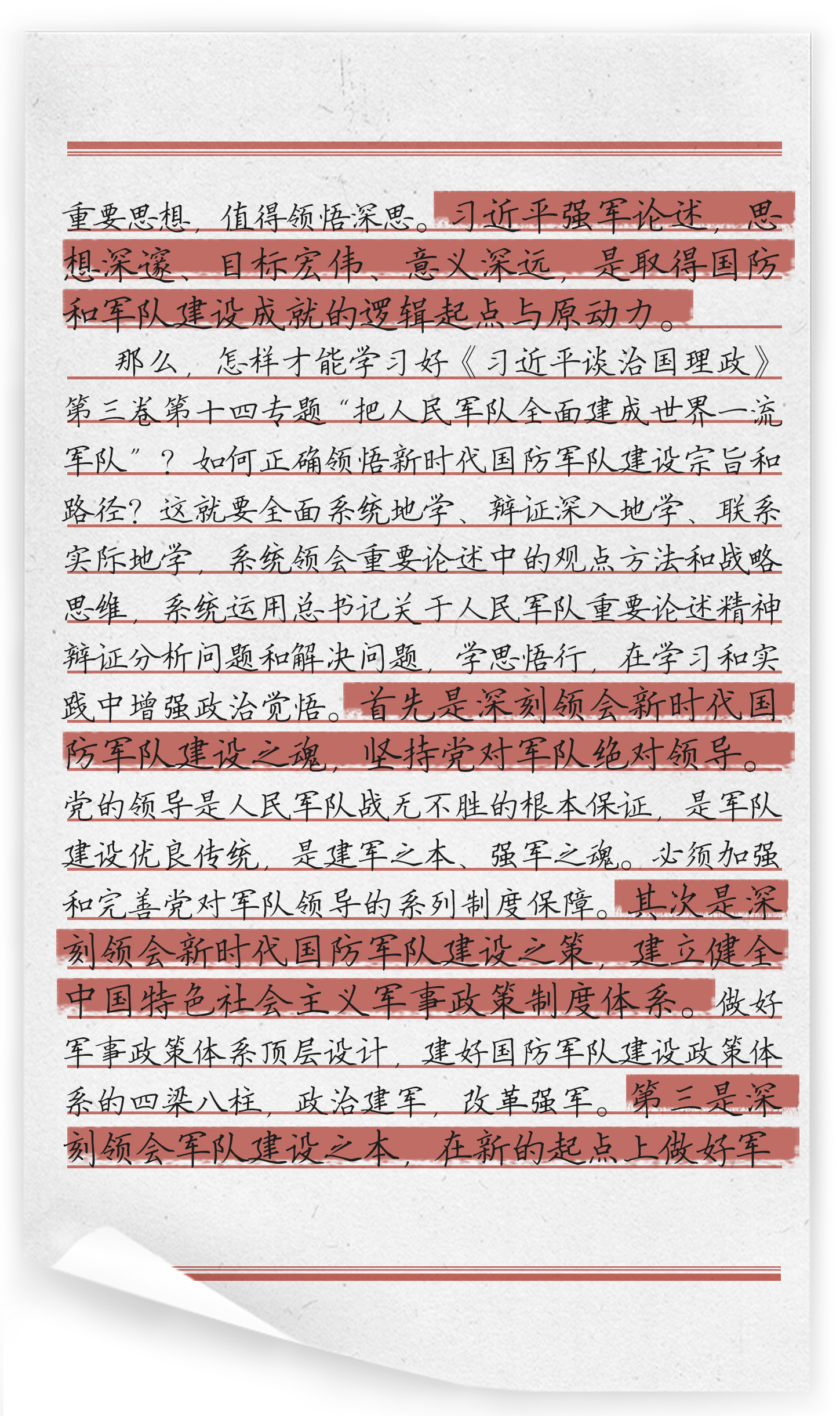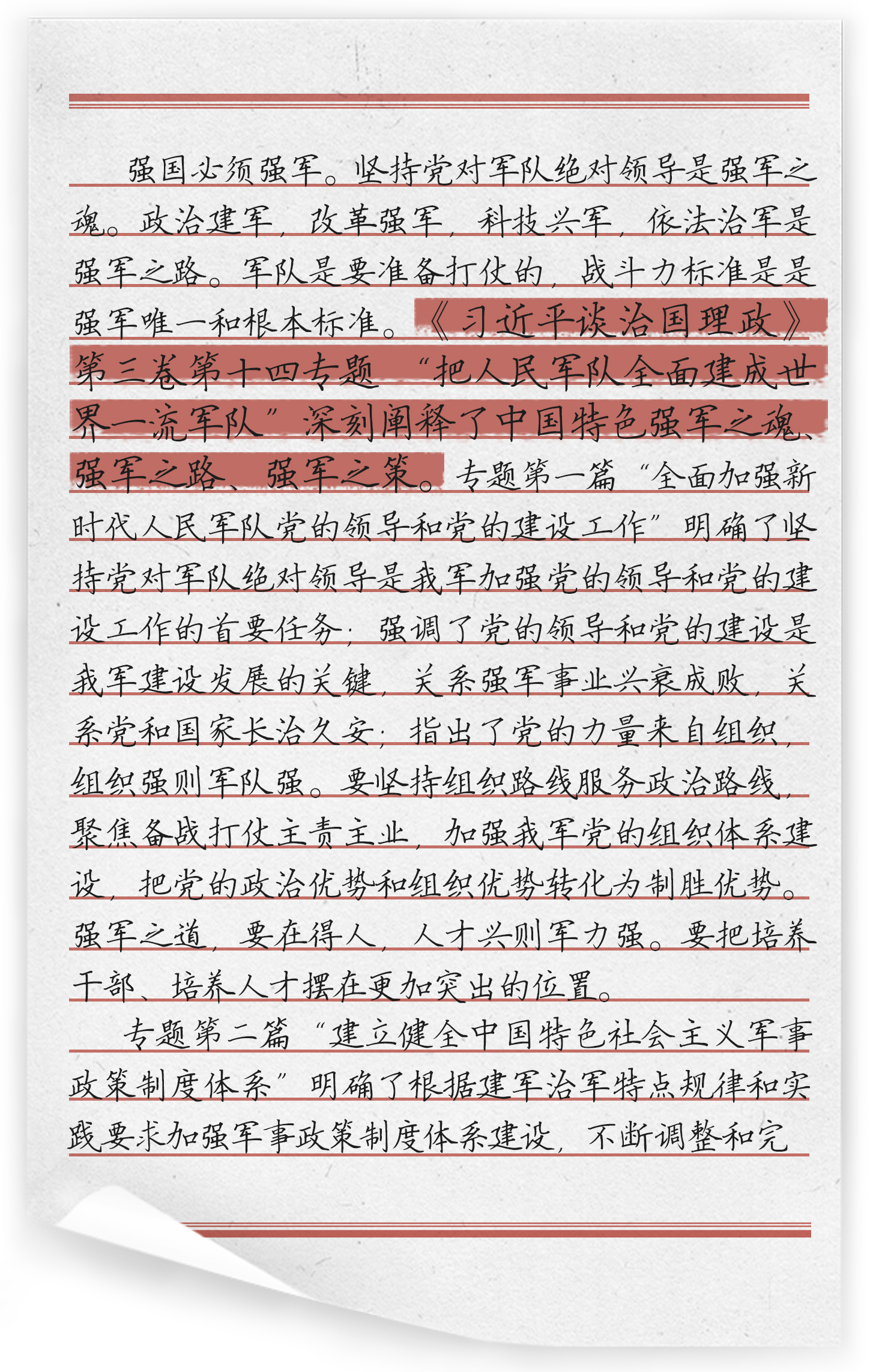《习近平谈治国理政》第三卷第十四专题“把人民军队全面建成世界一流军队”选编“全面加强新时代人民军队党的领导和党的建设工作”“建立健全中国特色社会主义军事政策制度体系”“在新的起点上做好军事斗争准备工作”3篇重要论述。当今世界形势正在发生深刻复杂变化,面临百年未有之大变局,中国国家安全和发展利益面临错综复杂的国际环境,深入学习《习近平谈治国理政》第三卷第十四专题,领会习近平总书记关于“把人民军队全面建成世界一流军队”的重要论述,对于全面加强国防和军队建设,全面建成世界一流军队,为顺利实现“两个一百年”奋斗目标和中华民族伟大复兴的中国梦提供坚强保障,具有重要的理论和现实意义。