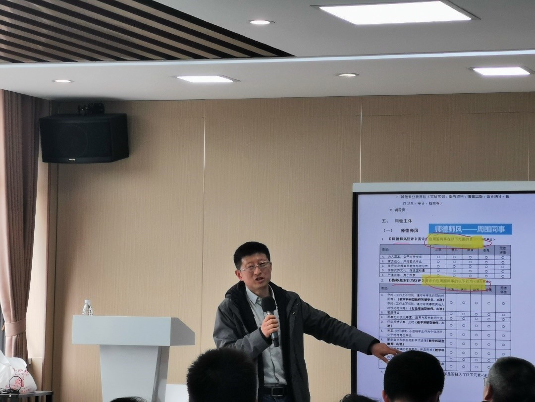 屈陆院长首先就18日安徽大学蔡敬民书记所作的主题报告进行了深入的剖析,对评估流程和迎评工作准备等方面进行了介绍,通过以问题为导向,以评促建、以评促强。接着,他着重强调了其中有关思政课教学和思政课教师技能的要求。在此基础上,他对全院思政课教师提出了希望 :1、希望老师们时刻谨记立德树人根本任务,端正教学态度,2、希望老师们用心学习,扎实做好教育教学工作,3、希望老师们严谨地完成教学档案的编制和归档。
