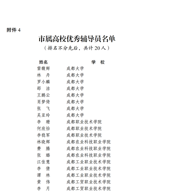 为不断加强教师育德能力建设,选树一批教书育人典范,激发广大德育工作者的积极性、创造性,根据《中共成都市委教育工作委员会关于开展2023年度成都市优秀班主任、优秀德育工作者、优秀班主任标兵和市属高校优秀辅导员评选工作的通知》(成教工委函〔2023〕29号)精神,经审核推荐、专家评审、审议公示,决定评选付珮琳等35人为“成都市优秀班主任标兵”,杜燕等664人为“成都市优秀班主任”,吴必英等271人为“成都市优秀德育工作者”,雷馥鲜等20人为“市属高校优秀辅导员”。