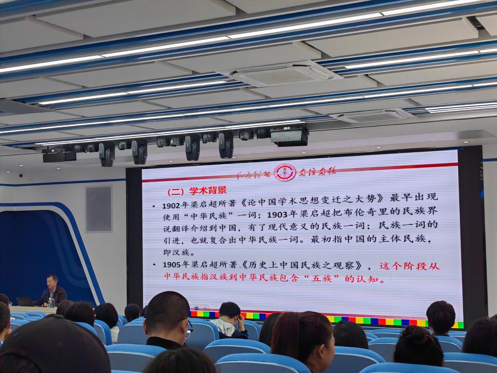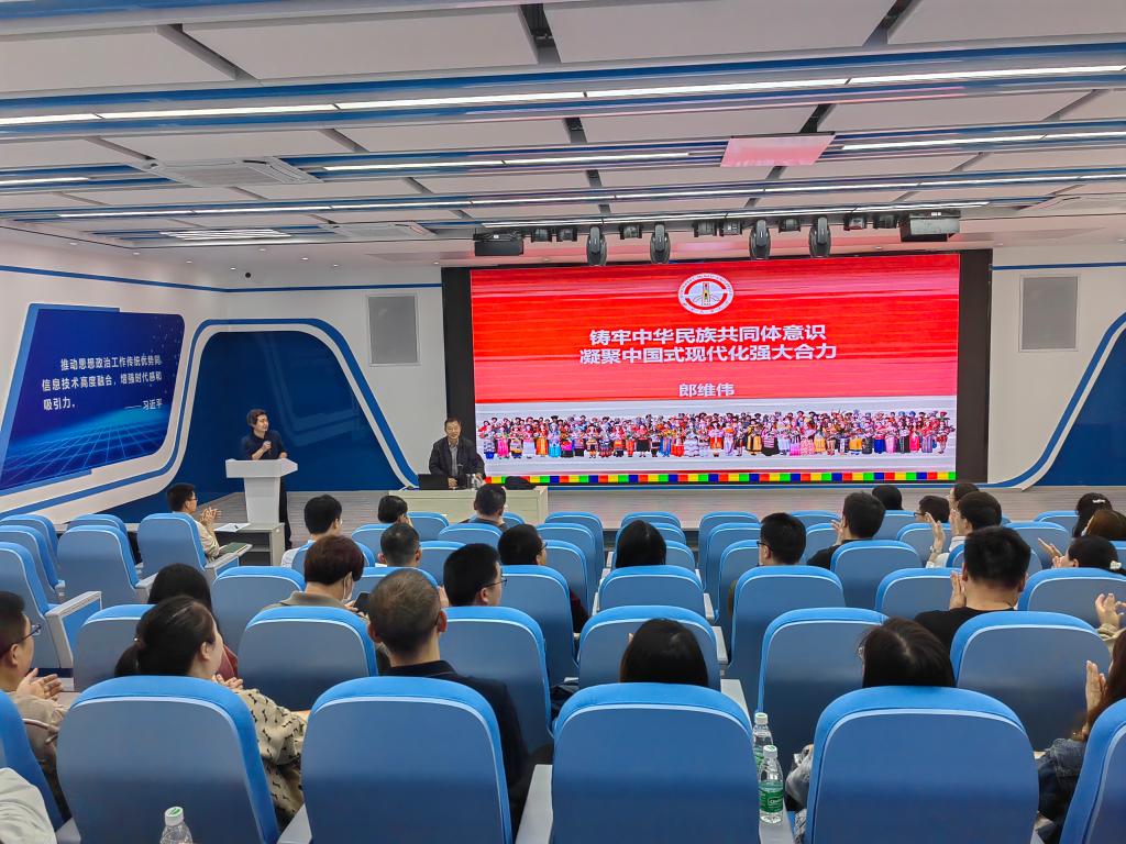 邀请了西南民族大学二级教授、博士生导师、四川省学术和技术带头人郎维伟教授作了主题为《铸牢中华民族共同体意识凝聚中国式现代化强大合力》的学术报告。郎教授首先从政治和学术背景解释了“中华民族共同体”和“中国式现代化”的概念,郎教授接着分析了铸牢中华民族共同体意识的理论内涵;最后,他深入探讨了铸牢中华民族共同体意识的核心任务,尤其强调了“五个认同”,即,对伟大祖国、中华民族、中华文化、中国共产党、中国特色社会主义的认同的重要任务。郎教授理论功底深厚,旁征博引,加深了老师们对主题的理解。在郎教授专题讲座后,现场老师就专题内容进行了提问,郎教授详细解答了老师们的提问。