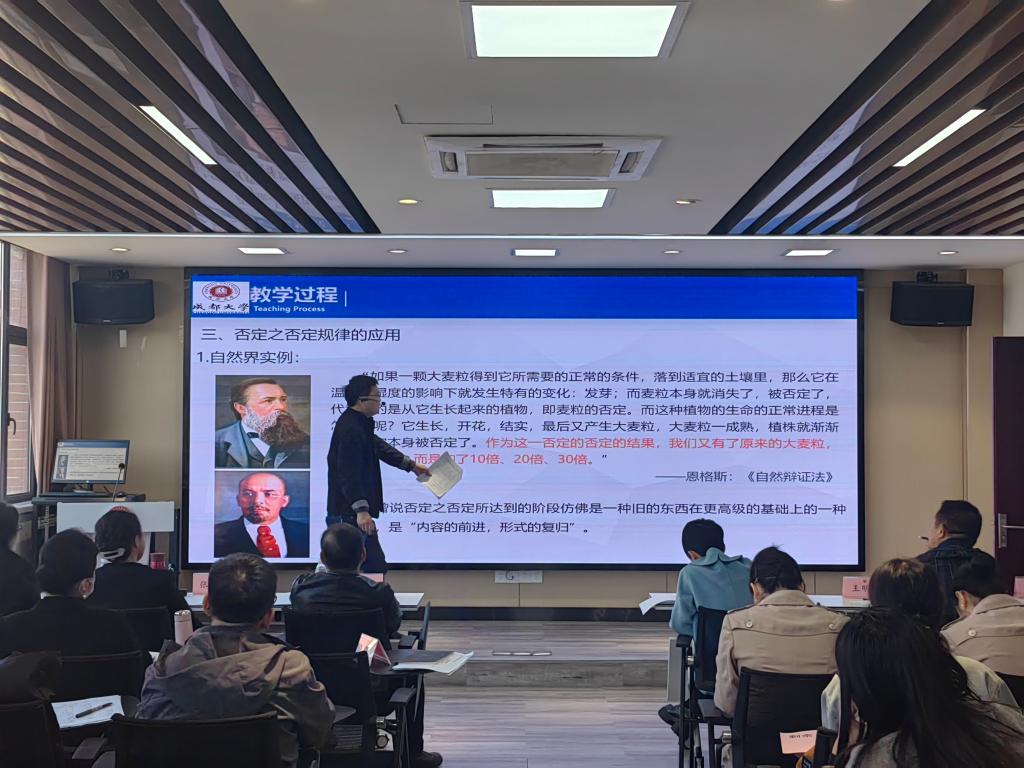 教学竞赛第一个环节,参赛教师依次上台进行课堂展示。周后燕老师的授课主题为《新文化运动的兴起及其意义》,唐国老师的授课主题为《否定之否定规律》,杨运筹老师的授课主题为《从教育大国迈向教育强国》,彭波老师的授课主题为《为人民而战——解放战争时期中国共产党如何改造战俘》,张力老师的授课主题为《坚持“两个毫不动摇”》,秦晶老师的授课主题为《锦绣中华,蜀锦纹样中的文明密码》,何若阳老师的授课主题为《新中国第一条铁路:成渝铁路》,这些教师围绕《形势与政策》、《中国近现代史纲要》、《毛泽东思想和中国特色社会主义思想体系概论》、《习近平新时代中国特色社会主义思想》和《马克思主义基本原理》课程来选择的主题,为老师们带来了一场思政课教学的示范课。