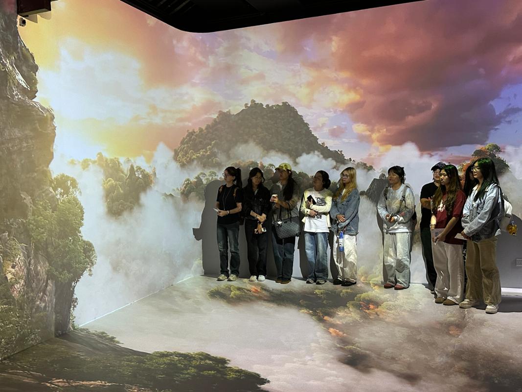步入“史学巨擘”展区,“江左修书”场景还原则让同学们身临其境体会常璩“情系生民、丹心著史”的治学精神;在“垂范千古”展区,华阳长卷光影沉浸空间用科技手段演绎蜀地风物与农技发展,而方志阁内收藏的3000余本西南地区方志典籍,让同学们深刻认识到《华阳国志》作为天府文化文献宝库的深远影响。参观中,同学们借助 AI 互动装置与常璩“跨时空对话”,在触控屏上查阅方志原文,现场学习氛围浓厚。