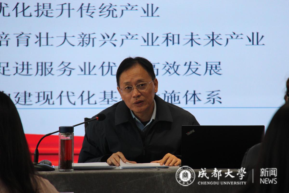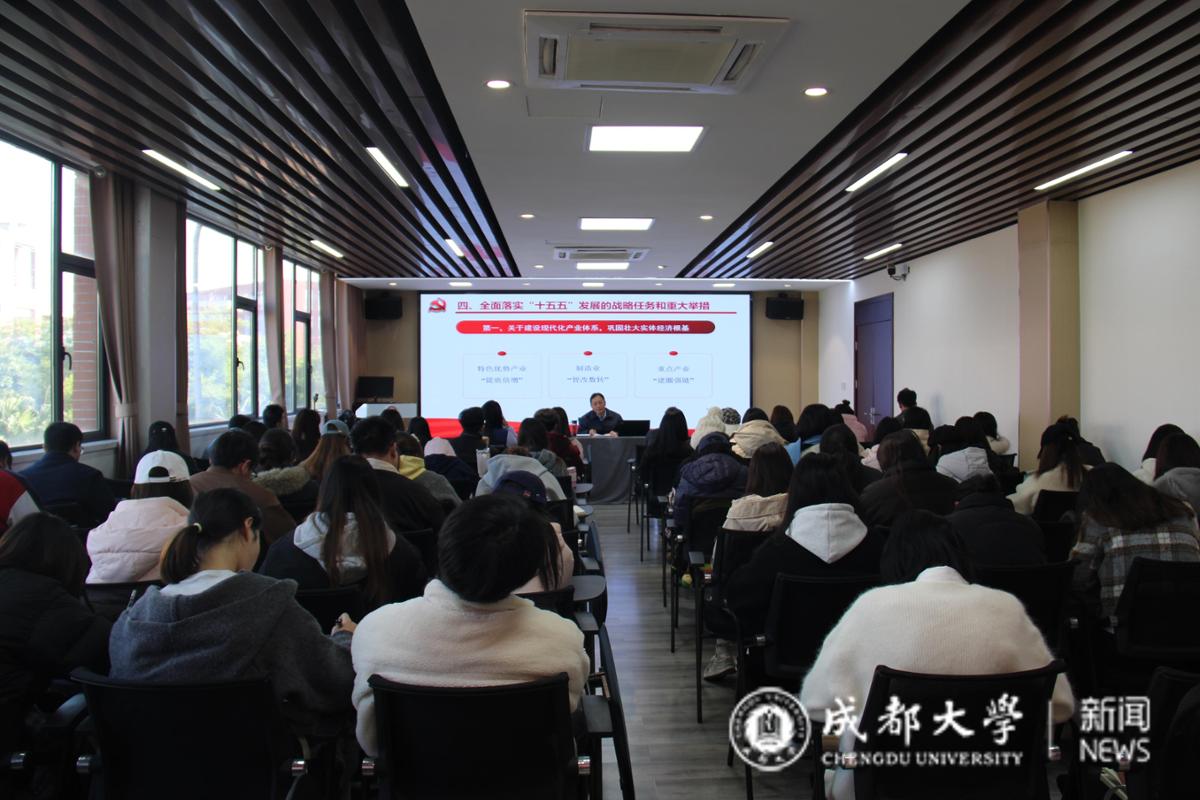 刘强书记紧扣全会精神,深刻剖析了“十五五”时期国家发展的宏伟蓝图与战略定位。他引导同学们超越文本表述,深入理解全会重大决策背后深远的历史逻辑、理论逻辑与实践逻辑。通过回顾“十四五”时期国家在经济稳健增长、科技自立自强、高水平对外开放等方面取得的辉煌成就,以及四川省、成都市和学校自身跨越式发展的生动实践,他揭示了国家发展“一张蓝图绘到底”的战略定力与成功密码,帮助同学们站在时代高度,准确把握中国式现代化的前进方向与行动标杆。