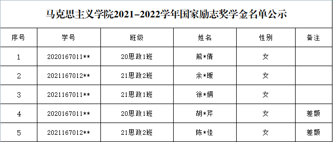 汇总审核,在公平、公正、公开的原则下,拟推荐熊*倩等5人为2022—2023学年本科学生国家助学金资助对象,其中包含差额2人,现将名单进行公示。