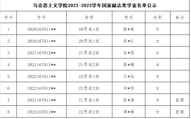 汇总审核,在公平、公正、公开的原则下,拟推荐熊*倩等8人为2023学年国家励志奖学金资助对象,其中包含差额2人,现将名单进行公示。