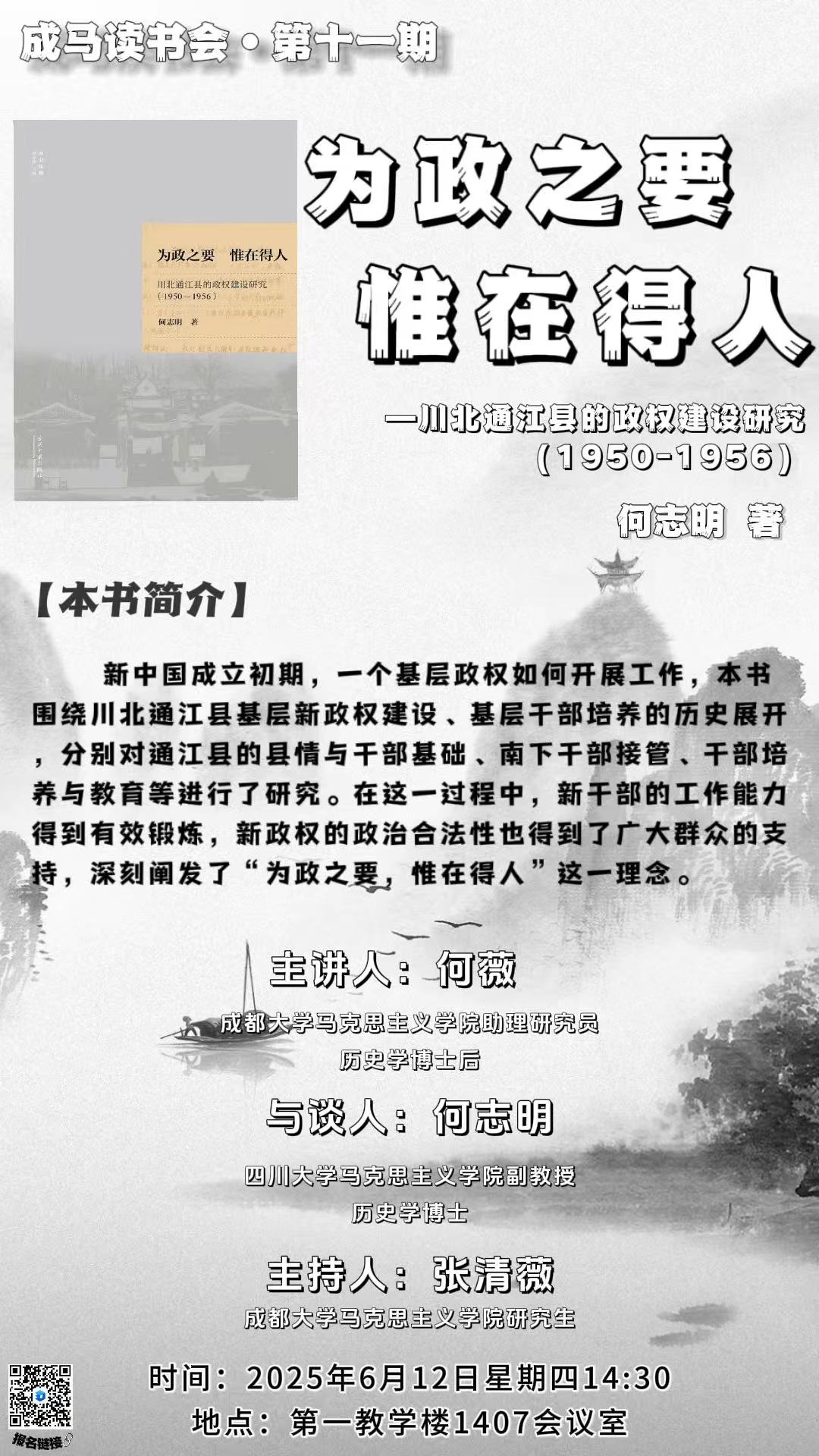 副教授,硕士生导师,南京大学历史学博士。主要从事中共党史研究,著有《为政之要惟在得人:川北通江县的政权建设研究(1950-1956)》,在《近代史研究》《中共党史研究》等刊物发表论文三十余篇,主持国家社科基金3项(含1项重点项目)。学术兼职:教育部学位论文抽检评审专家;重要专业期刊匿名审稿人;成都市党史学会理事等。